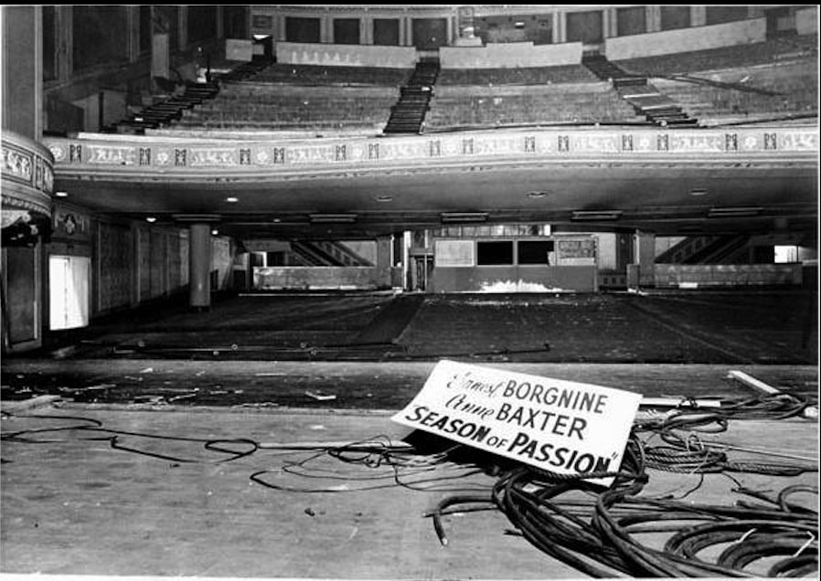 This August 18, 1963 photograph shows the auditorium at the Stillman Theater in the process of being demolished just weeks after the showing of its last movie, Lawrence of Arabia, on July 28. Season of Passion, the movie identified on the sign unexplainably lying on the theater's stage during demolition, was shown at the Stillman Theater two years earlier in 1961. | Source: Cleveland State University, Michael Schwartz Library, Special CollectionsDownload Original File