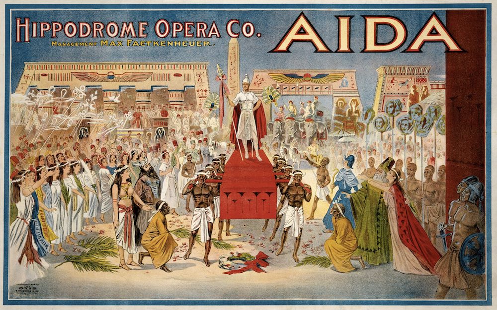 This 1908 poster by the Hippodrome Opera Co. of Cleveland advertised Aida, a four-part Verdi opera set in ancient Egypt. In the opera, Aida, an Ethiopian princess, has been captured by the Egyptians. The poster depicts "the triumphal scene in act 2, scene 2." | Creator: Otis Lithograph Co. | Date: 1908 | Source: Library of Congress Prints and Photographs DivisionDownload Original File
