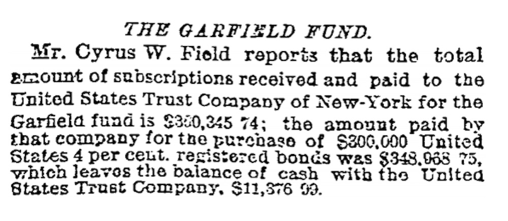 During the time from after Garfield had been shot and his death, a subscription fund was created to help support what ultimately would be Lucretia and the children. The fund was created by Cyrus Fields, the founder of the Trans-Sub Atlantic Telegraph [and eventual Telephone] Line. Mr. Fields paid the money to have news reports posted in papers all across the country, encouraging people to donate to the fund what they could to help support the president’s young wife and children. Lucretia was forty-nine when Garfield died and the kids were all between eight and eighteen years old. The fund continued past the time of Garfield‘s death as well as past the time of the funeral and ultimately ended on October 15, 1881. News reporters constantly kept up to date on the donations to the Garfield Fund. This clipping from the New York Times shows the reporting on the total success of the Fund. | Date: October 18, 1881 | Source: New York Times Download Original File