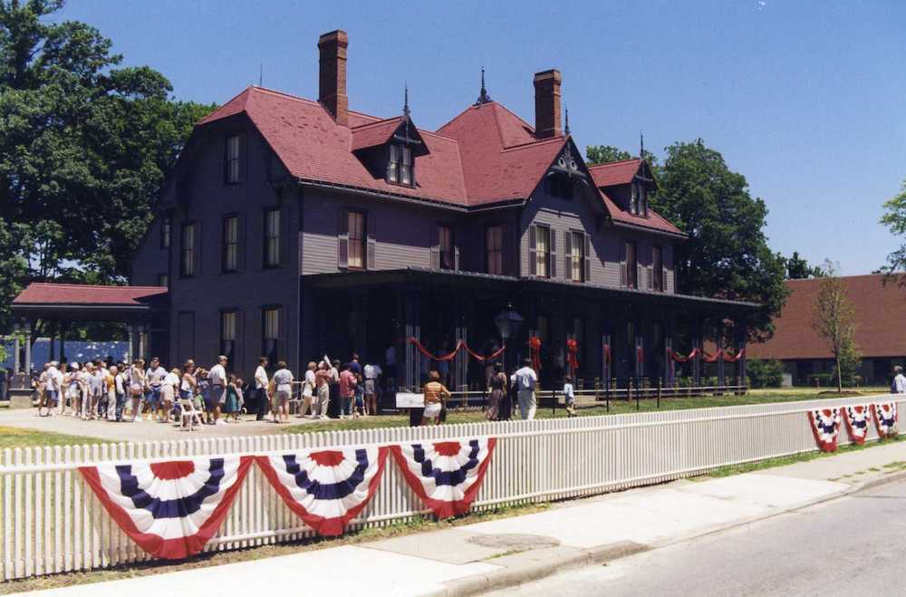 The restoration of the Garfield home was complete in 1998, and the site re-opened to the public on June 19, 1998. The night before there was a Garfield Family Reunion, where over 100 members of the family spanning multiple generations came to celebrate the reopening of their ancestor’s beloved home. The main day consisted of a large ceremony with live music and people all over the site. There was an open house for visitors to finally see the finished interior, and when they were done people were able to enjoy the other historically restored buildings on the site. The line to get into the home wrapped around the whole east side of the house, and people were parking at the mall and walk down to the site. There were even people from the Post Office doing same day cancellations commemorate the event. Although the restoration had faced both good and bad press during the work itself, the reopening of the home was ultimately met with a positive response from the Mentor community and beyond. | Date: 1998 | Source: National Park Service Download Original File