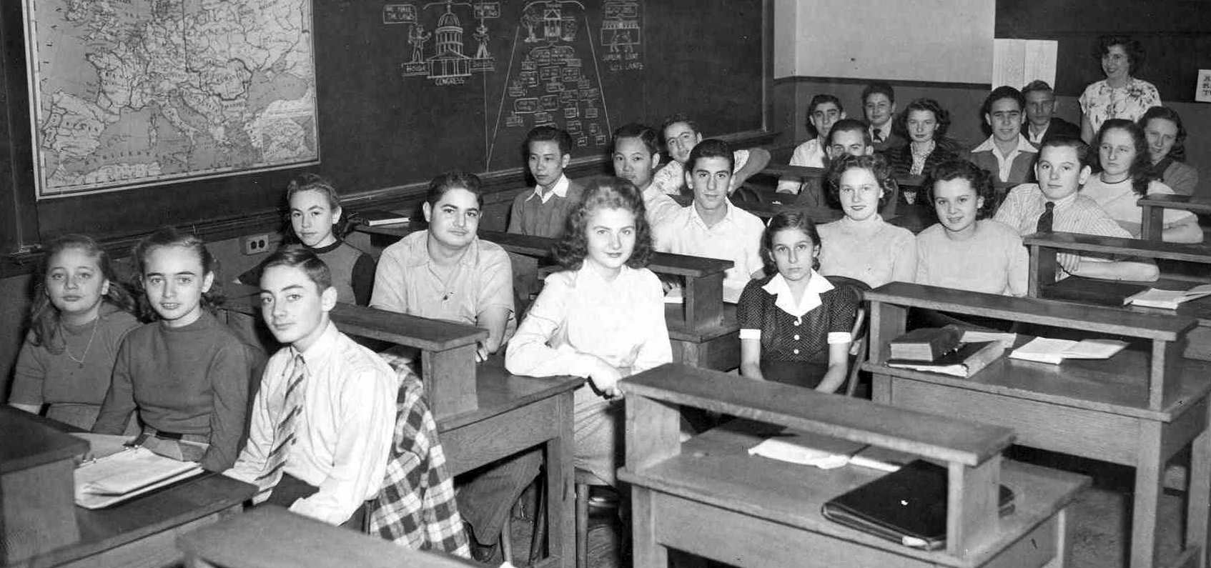 Recently immigrated students from Europe attend English class at John Hay High School in October 1949. Although European immigration had since peaked, Cleveland still had enough of an immigrant population at this time to warrant holding such classes in some city schools.