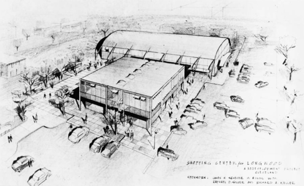 The Longwood (Area B) was originally intended to have two new shopping centers. One shopping center was intended to have on site parking, while the other would utilize street parking. The sketch above depicts the shopping center with on site parking, but was never constructed. | Date: February 11, 1957 | Source: Cleveland Memory Project, Cleveland State University Library Special CollectionsDownload Original File