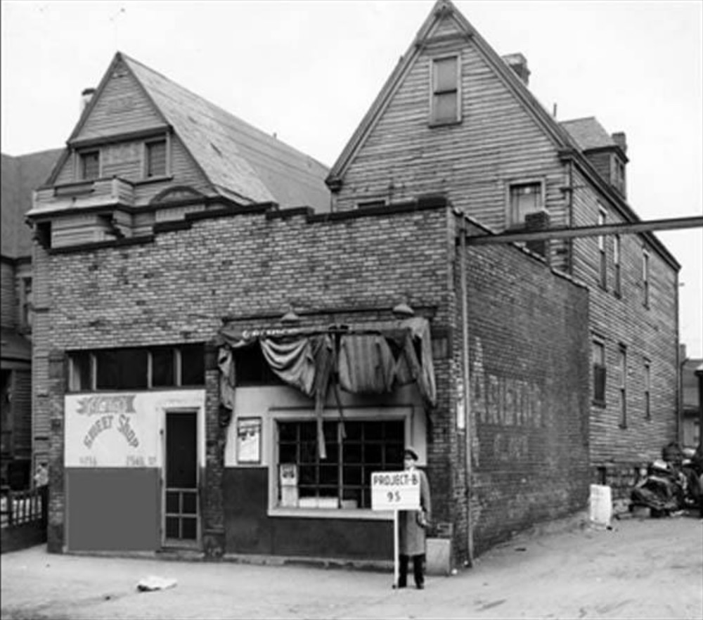 Located on East 37th street, the dilapidated Congregation Shomre Shabbos was acquired by Russian immigrants in 1921, but was sold in 1923 and the congregation relocated. The building appears to be abandoned and was one of the many buildings demolished for the Longwood (Area B) project. | Date: 1959 | Source: Cleveland Memory Project, Cleveland State University Library Special CollectionsDownload Original File