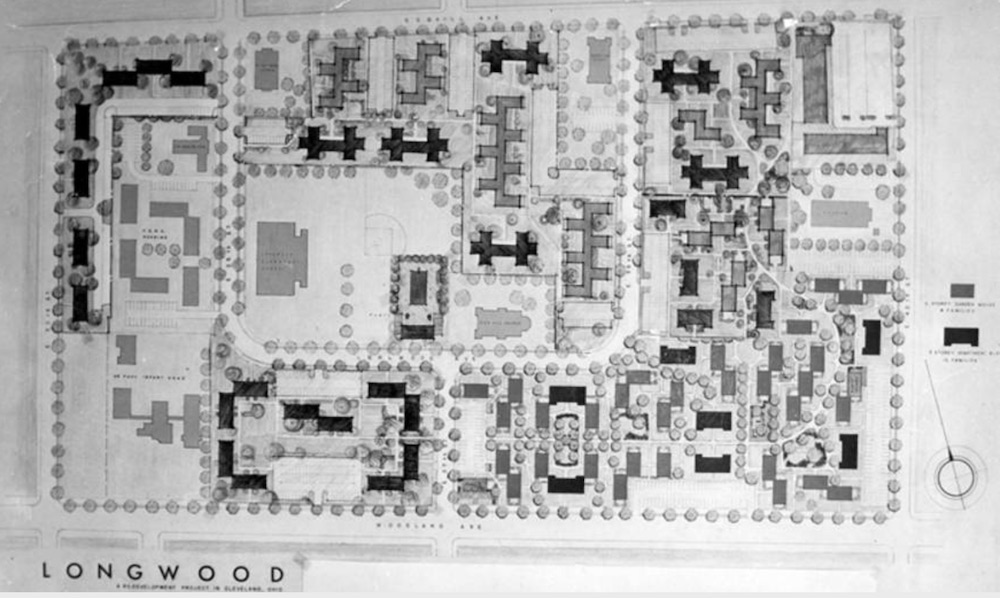 The proposed development for Longwood (Area B) included multiple affordable housing units, two shopping centers, and a playground. The plan also called for the construction of a new street designed to cut down on through traffic that would connect East 35th, East 37th, and East 38th. | Date: March 19, 1957 | Source: Cleveland Memory Project, Cleveland State University Library Special CollectionsDownload Original File