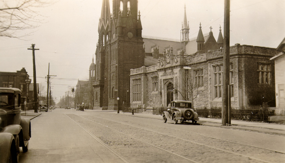 South Branch Library with St. Michael Archangel Church in the background, c., 1933. | Source: Cleveland Public Library Digital Archives