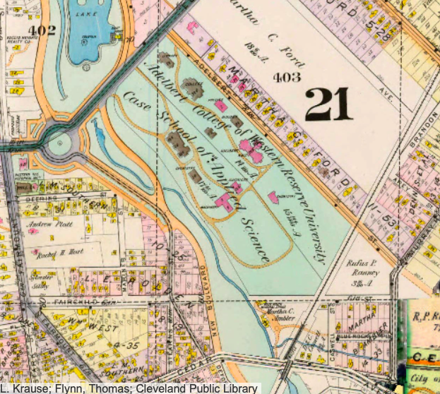 The street map from 1898 illustrates the neighboring campuses of Western Reserve University and Case School of Applied Science. They are bounded by Euclid Avenue and Adelbert (west and north) and by New Boulevard (later East and MLK) to the south. The campus spread further into surrounding University Circle spaces during the next 120 years | Date: 1898 | Source: https://www.arcgis.com/apps/View/index.html?appid=ddb0ee6134d64de4adaaa3660308abfd | Rights: USDA FSA, F.L. Krause; Flynn, Thomas; Cleveland Public Library.Download Original File