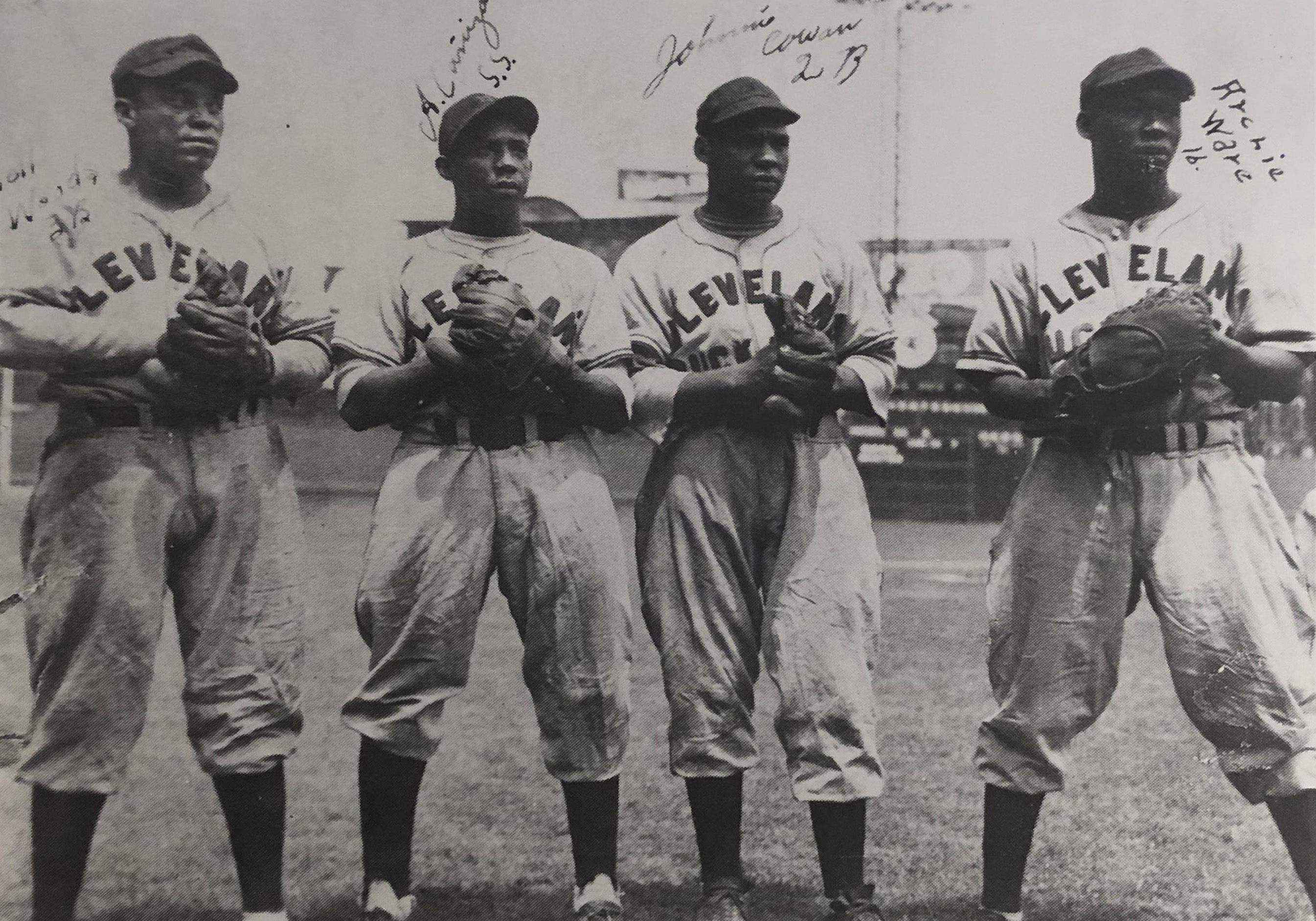 (L to R) Parnell Woods, Avelino Canozeris, Johnnie Cowan, Archie Ware | Date: 1945 | Source: Baseball Heritage Museum | Rights: All the rights of this photo belong to the Baseball Heritage Museum. Download Original File