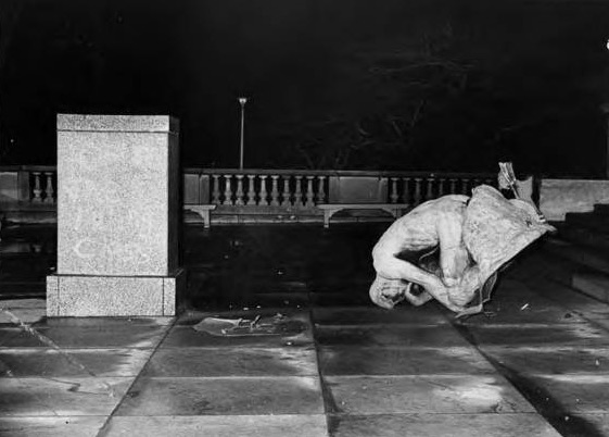View of The Thinker at the Cleveland Museum of Art after the March 1970 bombing. The statue itself was blown off its pedestal, landing upend. | Date: 1970 | Source: Special Collections Department, Cleveland State UniversityDownload Original File
