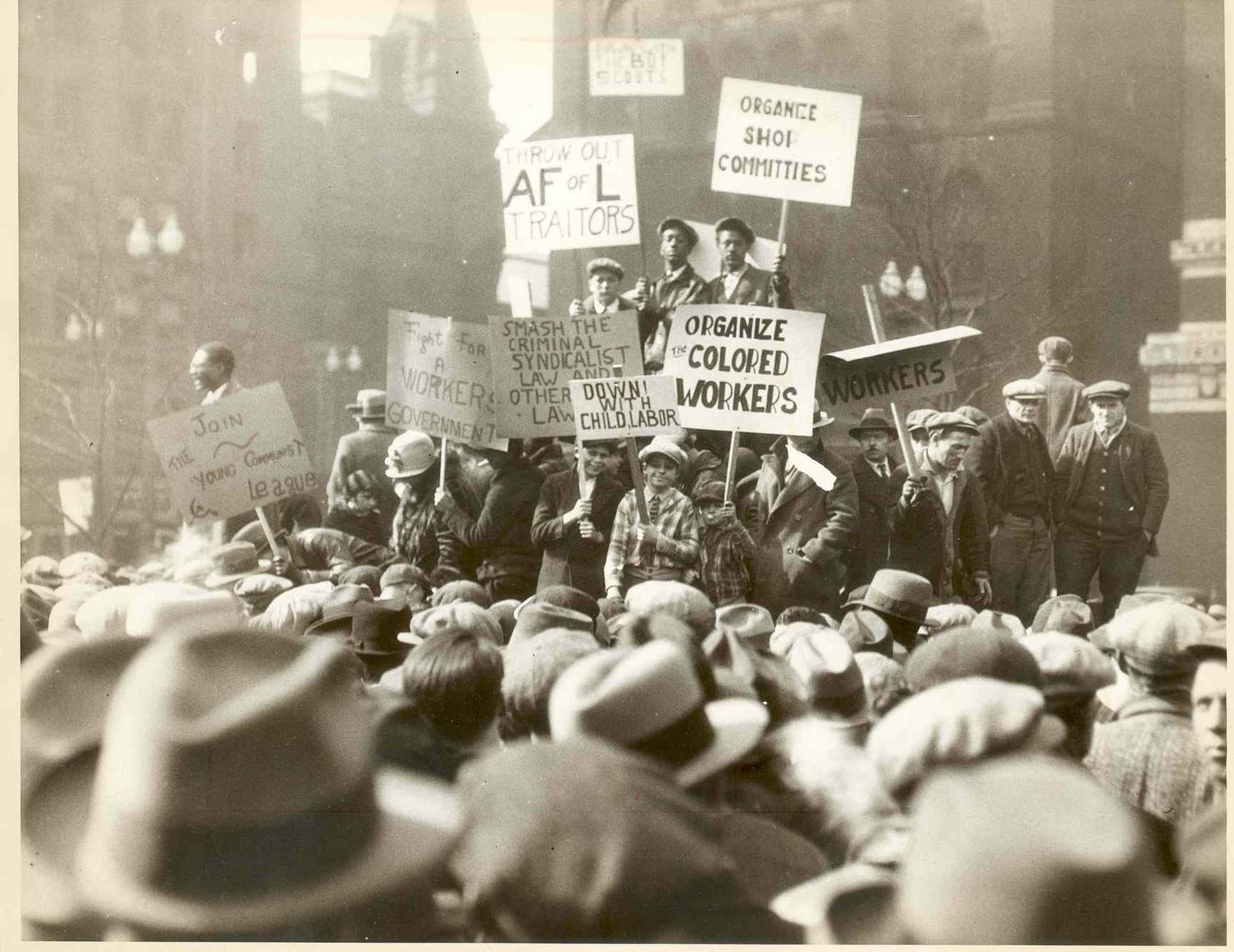 This group gathered at Public Square on May Day 1930 consists - at least partially - of members of the Young Communist League. At a time when labor unions often excluded or discriminated against African-Americans, leftist groups were friendly to the needs of black workers and used their influence among the working class to agitate for civil rights and labor reforms. | Date: 1930 | Source: Cleveland State Library Special CollectionsDownload Original File