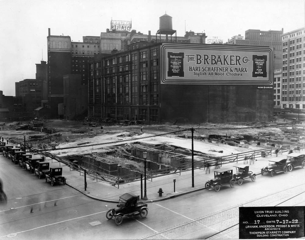 As this photograph graphically shows, by July 17, 1922, the site for the new Union Trust Building had been largely cleared. Chester Avenue is to the left, and East Ninth to the right, in the picture. | Source: Cleveland Public Library, Photograph CollectionDownload Original File
