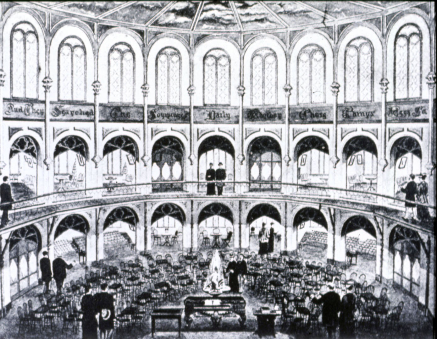 The Akron Plan takes its name from the city of the construction's first use, Akron, Ohio, which was the site where the First Methodist Episcopal Church, designed by Lewis Miller, Walter Blythe, and Jacob Snyder (1866-1870) was created. The Akron Plan Sunday school styles is easily adapted into a variety of other architectural and decorative styles -- Gothic, much like North Presbyterian, but also Romanesque, Colonial, and Neoclassical Revivals. The arrangement of the Sunday school rooms around the sanctuary, and the way that the rooms express on the exterior of the build, stand to signify the church’s primary concern with church education and community. | Source: Hendrick, Ellwood, 1861-1930, Lewis Miller: a Biographical Essay, New York: G.P. Putnam's sons, 1925.Download Original File
