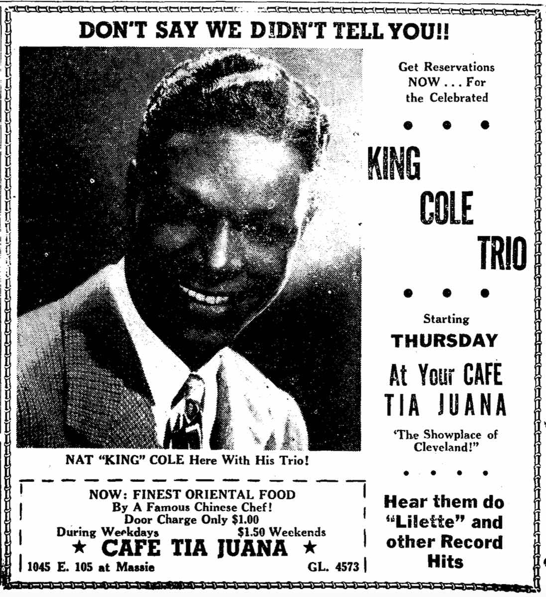 Impressively, Cafe Tia Juana’s first two years of operation were the ones to host the nation’s most famous jazz icons including Dizzy Gillespie, the King Cole Trio, Billie Holiday, Sarah Vaughan, and Ella Fitzgerald, with The King Cole Trio being advertised as an upcoming performance in the club’s introductory article in 1947. | Date: November 6, 1948 | Source: Cleveland Call and PostDownload Original File