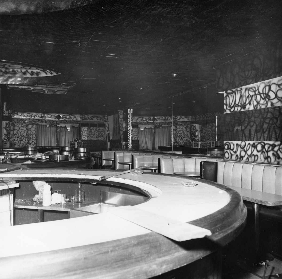 This photo was taken by the City of Cleveland shortly after Cafe Tia Juana was permanently closed in 1969. When the club was first opened, it was known for its plush and lavish interior. Charles L. Sallee Jr., the first African American graduate of the Cleveland Institute of Art, designed the club with unapologetic lavishness while incorporating a colorfully playful, so-called “Mexican style” with an element of posh sophistication, using velvet carpets and excessive draperies. “Using a south of the border theme, Sallee turned the space into a swank café, hanging large mirrors on the wall, laying down luxurious carpet, painting beautiful large Mexican themed murals, and creating a smooth ambiance with warm-colored spotlighting.”
