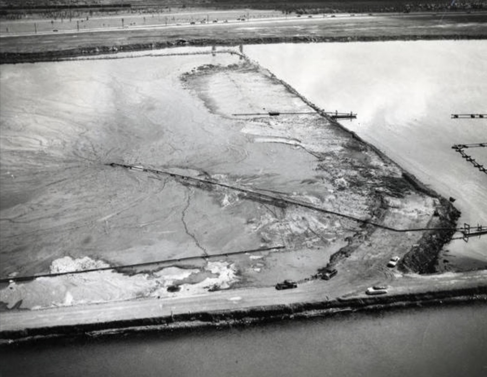 New mud fill, created from river dredging, at Burke Lakefront Airport along with retaining wall | Creator: Fred Bottomer | Date: August 30, 1950 | Source: Cleveland Memory Project, Cleveland State University Library Special CollectionsDownload Original File