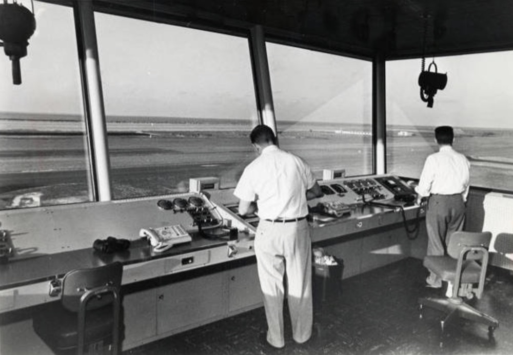 Interior of the tower at Burke Lakefront with two controllers working with computers | Date: January 18, 1962 | Source: Cleveland Memory Project, Cleveland State University Library Special CollectionsDownload Original File