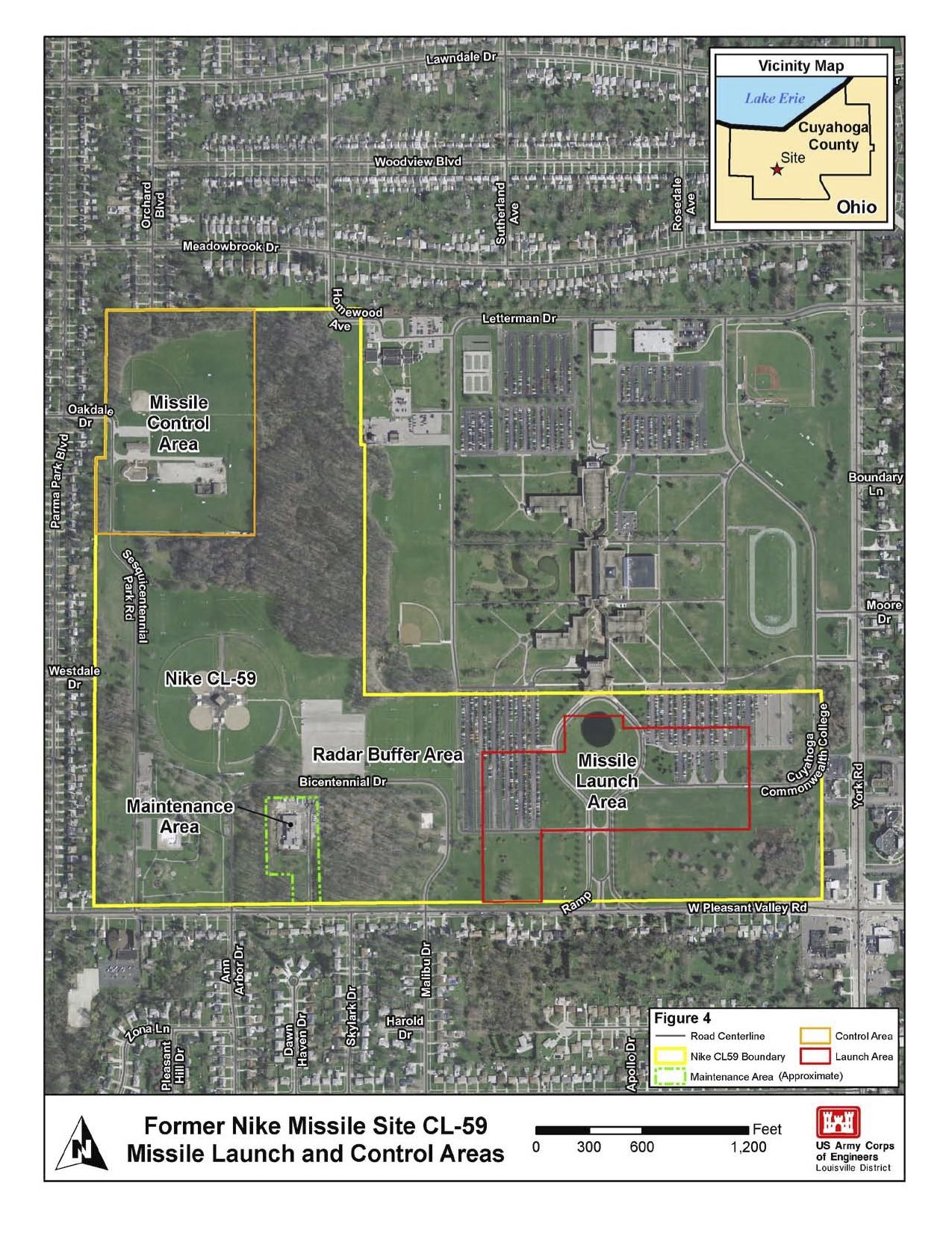 A (much clearer) aerial map displaying a more modern landscape as well as the same outlines from the previous two maps shows the area today. Perhaps the most intriguing out of the maps of CL-59, this image answers the question of what one might find today in the space once occupied by the missile base. An important aspect of the map to point out is the fact that Cuyahoga Community College's Western Campus is the closest modern structure to what once was CL-59's launch area. The area underneath the red outline is where the weapons would have been stored. | Creator: United States Army Corps of Engineers Louisville District | Date: August 4, 2010 | Source: Proposed Plan for Former Nike Site CL-59Download Original File