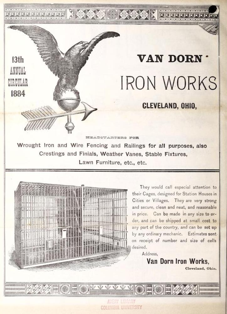 Van Dorn Iron Works was the largest jail cell producer in the world throughout the twentieth century. Van Dorn supplied jail cells throughout the U.S. and greater Cleveland area until 1967 when they ceased jail cell production. | Creator: archive.org | Date: 1884 | Source: Columbia University Libraries | Rights: Used under a CC BY/NC license from Copyright Advisory Services of Columbia UniversityDownload Original File