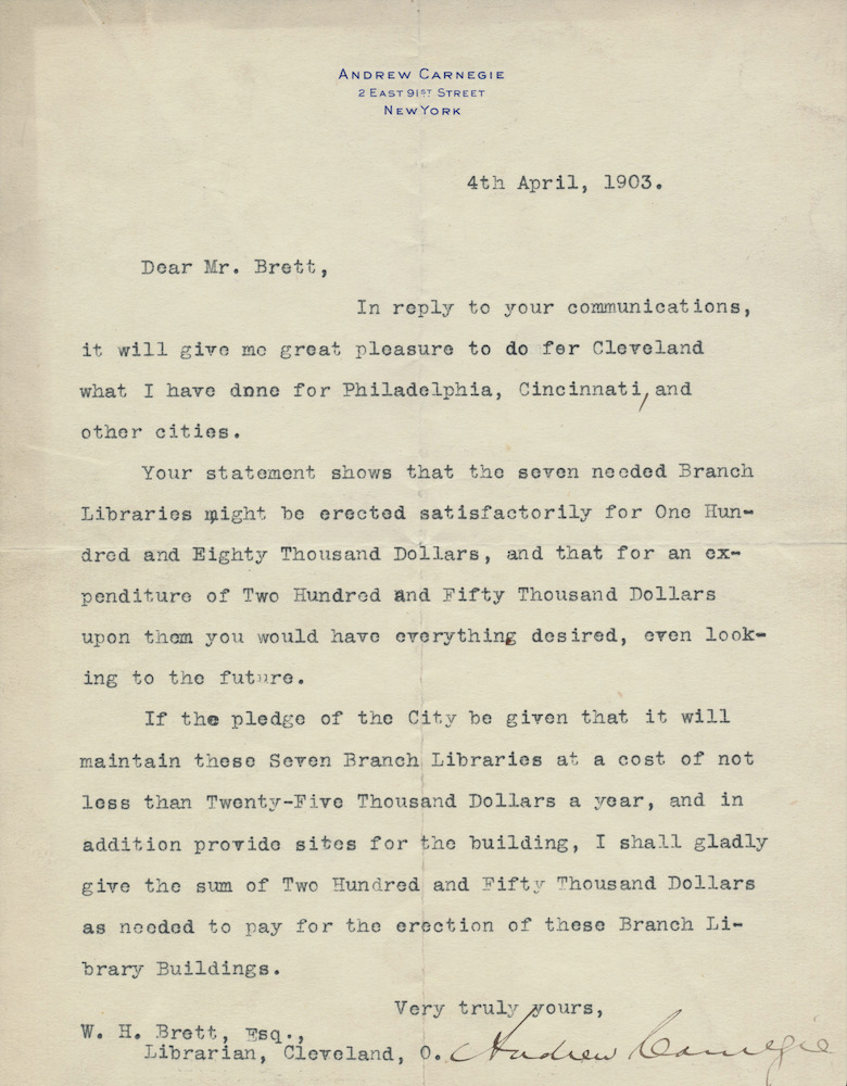 After learning from Brett that building the first five branches had exhausted the original donation, Carnegie agreed to donate an additional $123,000 to construct the last two branches—the new West Side Branch library and new South Branch library. In 1908, in order to ensure that there were sufficient funds to enable the City to purchase the land for the park and the Kentucky Street extension, he donated an additional $110,000. Without these last two donations, it is questionable whether the West Side branch library would ever have been built, let alone in the grand form of the building that sits on Fulton Road today. James Bertram, Andrew Carnegie's personal secretary, noted how extraordinary the first of these two additional donations were in a letter he wrote to the Library on July 2, 1907: "Mr. Carnegie congratulates Cleveland upon exceeding even Pittsburg in proportion to the amount of population, in Library appropriation, placing Cleveland first of all."