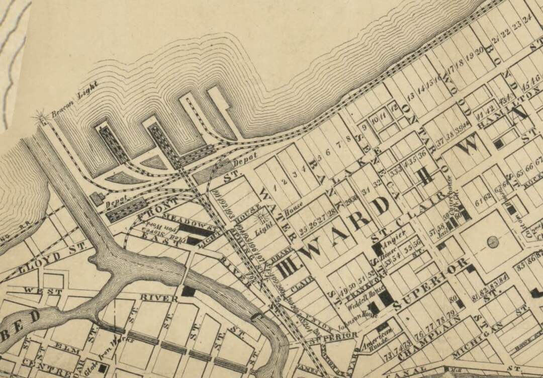 In the 1830s the immediately surrounding neighborhood was still quite bucolic with small residences, grassy plots, and a few grand homes, including Levi Johnson’s Mansard-style home just south of the Lighthouse. Cleveland’s commercial center was a few short blocks to the south and east, lining Superior Street between the Cuyahoga River and Public Square. Within fifteen years of the lighthouse’s completion, three grand hotels—the American House (1837), the Franklin House (1845), and the Weddell House (1847)—would offer testament to the area’s increasing vigor. In 1852, Johnson, who also was a shipbuilder and real-estate entrepreneur, built his own hotel, the Johnson House, on Superior between Water and Bank (West 6th) streets.