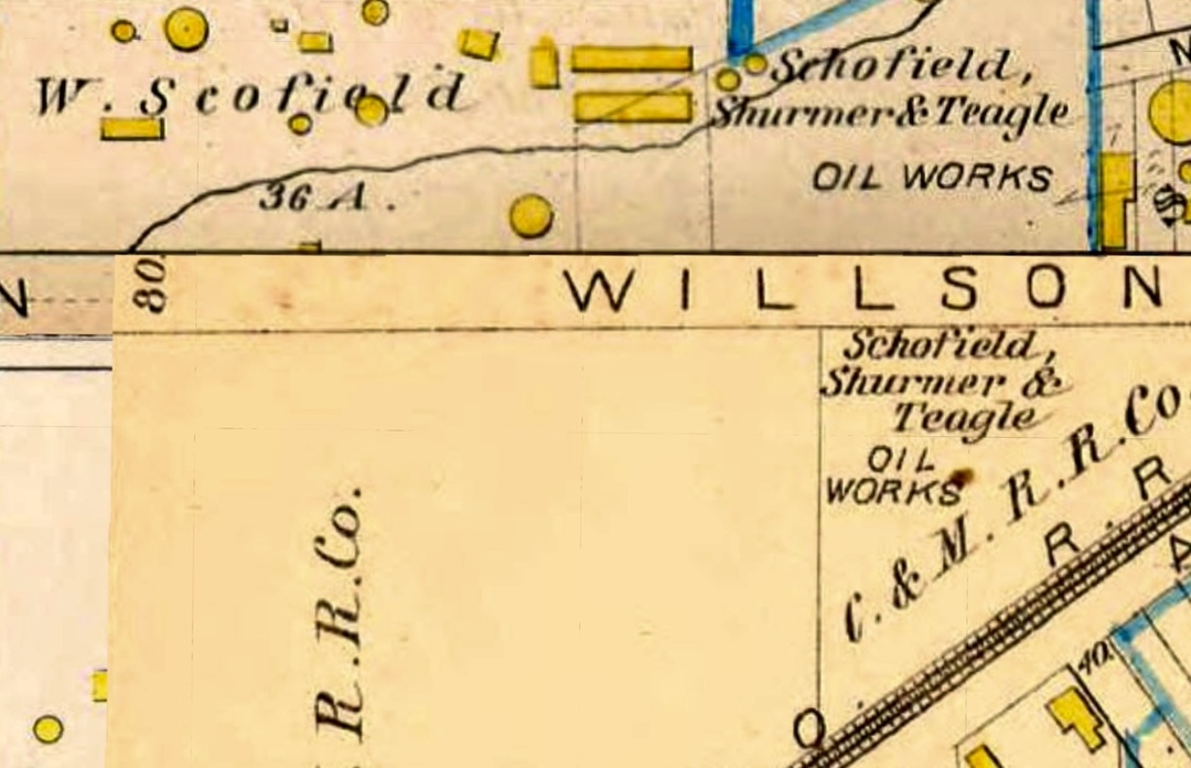 In 1872, the same year that he was forced out of the oil refining industry by Rockefeller's Standard Oil Company, W. C., as Scofield was known, entered the iron manufacturing industry, purchasing the historic Otis Iron Works on Whiskey Island. He renamed it Lake Erie Iron Company, expanded its operations to include a new facility for the manufacture of nuts and bolts on land located between East 63rd Street and Addison Avenue close to the tracks of the Lake Shore and Michigan Southern Railroad, and made it a very successful business. In 1874, two years after the Cleveland Massacre, Scofield formed a new partnership, built a new oil refinery on Willson Avenue (East 55th Street), north of Broadway and near the tracks of the Atlantic and Great Western Railroad, and re-entered the oil refining business, operating once again as Great Western Oil.