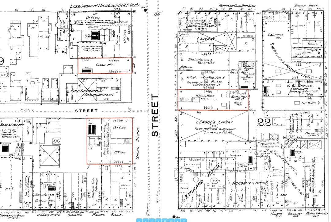 Another mystery associated with the Grand Arcade is: Why did W. C. Scofield decide to call this building an "arcade?" That term traditionally refers to a building with a covered passageway lined with retail shops on both sides. An article in the Cleveland Leader, on December 7, 1912, noted that "the building actually is not an arcade and received its name from the court and its many balconies opening from the inner office suites." However, there is no indication that the newspaper had obtained that explanation from W. C. Scofield who was still living at the time the article was published, and there may have been a reason, other than the explanation offered by the Leader, why Scofield used the term. There were, in fact, retail shops located on the first floor of the building in the decades of the 1880s and 1890s and some of these could have had interior storefronts and entrance ways on the court.