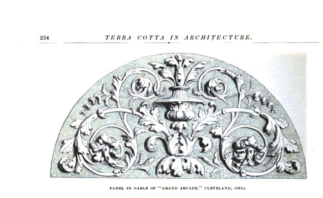Like some of the other buildings Levi Scofield designed, the Grand Arcade was designed to be grand and notable. Years after it was built, it was referred to by at least one newspaper as Cleveland 's first "modern" office building. Designed in the Neoclassical Revival style with elements of Neo-Grec, it is a brick and stone building that stands six stories tall (five floors above ground with a raised basement). Its exterior walls fronting St. Clair Avenue and West 4th Street are decorated with pilasters, capitals, belt courses, entablatures, ornamental swags and other details formed from cut sandstone and unglazed terra cotta. The construction cost of the building was $100,000 ($3 million+ in 2024 dollars).