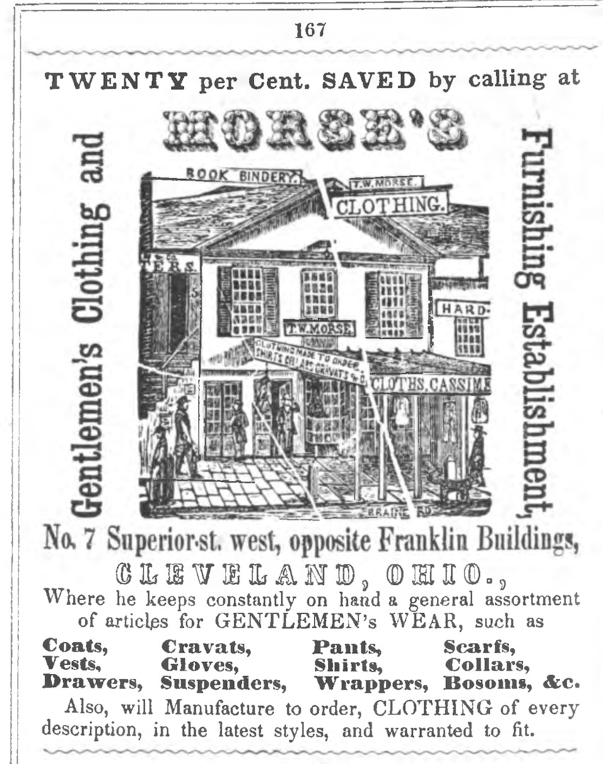 Nathan Perry's New Brick Store This advertisement in the December 14, 1819 Cleveland Register invites Clevelanders to shop at Nathan Perry's new store on the northeast corner of Superior and Water (W. 9th) Streets. The building was one of Cleveland's first brick buildings. Source: Pulling Up Roots, Book Two, by Christopher Eiben, at page 204.