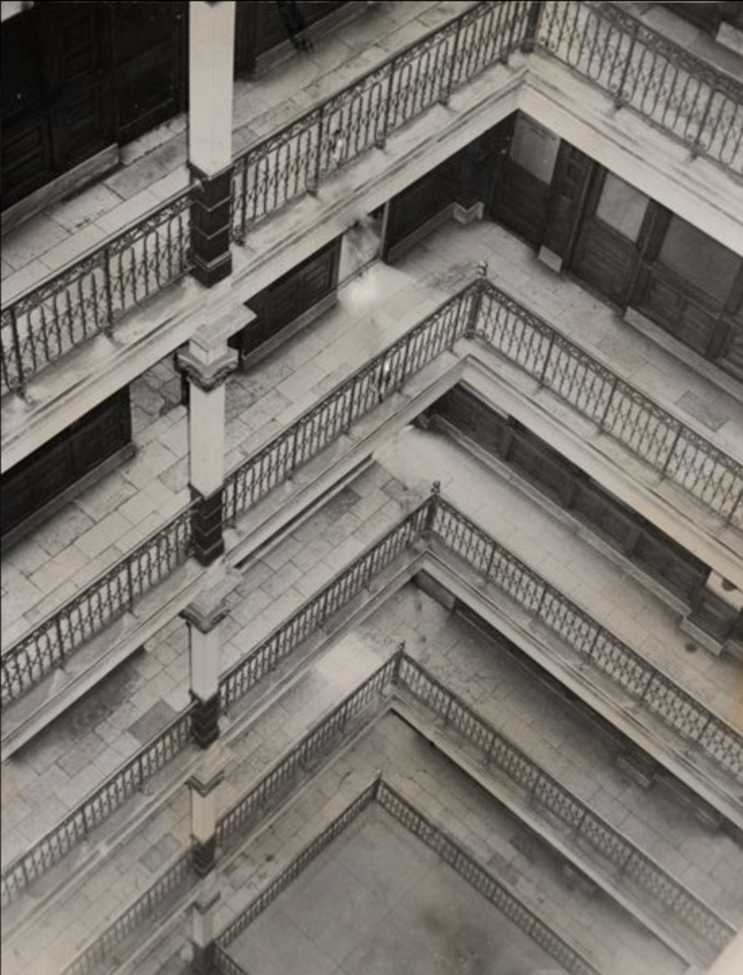 Interior Court One of the special features of this grand building—which no longer exists today—was the interior court, which provided interior access and lighting for tenants with office windows and doors overlooking it. Source: Cleveland Press Collection, Michael Schwartz Library Special Collections at Cleveland State University Date: May 8, 1953