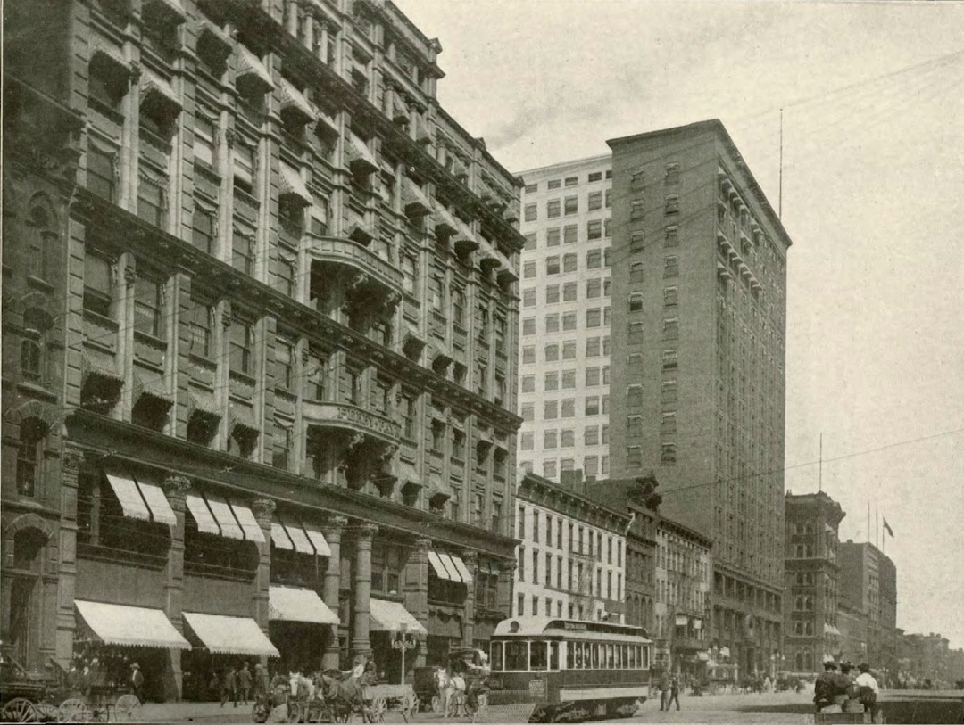 Fully Leased! By 1895, the year in which this photograph was taken, the Perry-Payne Building was fully leased. If you look carefully, you can read some of the names of office tenants printed on the windows of the building that overlooked Superior Avenue. Source: Cleveland Artworks Date: 1895