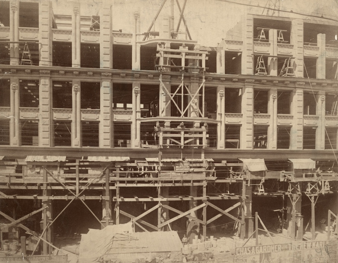 Under Construction The Perry-Payne Building was built from 1887 to 1889. This photo shows that, at the time it was taken in 1888, construction of the building had progressed to the fifth floor of the eight floor building. Also notable in the photo is the temporary sign on the building bearing the names of the architects Cudell and Richardson. Source: Cleveland Public Library, Photograph Collection