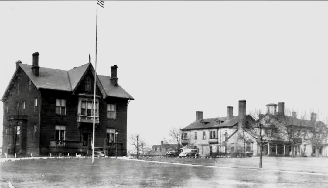 The Perry and Payne Euclid Avenue mansions This 1935 photograph shows the Nathan Perry (right) and Henry B. Payne (left) mansions several decades after their descendant owners moved off of Euclid Avenue and made a gift of the mansions to the American Red Cross during World War I. The Perry mansion was built in the 1830s, and the Payne mansion in 1849. Both mansions were razed in 1949. Today, their former site is occupied by East 22nd Street between Euclid and Chester Avenues and the Student Center and Berkman Hall on the Cleveland State University campus. Source: Cleveland Public Library, Photograph Collection