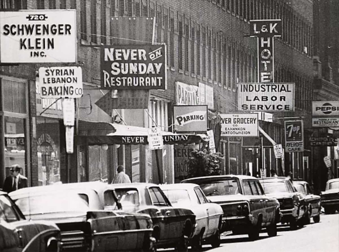 By the early 1940s, Plain Dealer columnist S. J. Kelly lamented that he “found Bolivar Road sadly depleted of its Greek. It is, in fact, a modern business thoroughfare and most of its classic residents are scattered over the city.” In the postwar years, as so many Clevelanders departed for the suburbs, remnants of ethnic communities beckoned as “old and colorful” anomalies in a downtown increasingly dominated by office towers and parking garages. As Bolivar Road transitioned from a complete neighborhood to the central business district for Greek, Lebanese, Syrian, and Palestinian populations that were now spread across the metropolitan area, it also gained greater popularity beyond these communities. A succession of "Grecian-American" restaurant-clubs at 714 Bolivar — The Athenian, Grecian Nites, and Never On Sunday — enticed patrons with belly dancers and bouzouki music. Middle East Restaurant, opening in 1962, introduced many Clevelanders to Middle Eastern cuisine. The restaurant’s proprietor, Edward Khouri, a native of Aramoun, a village near Beirut, built a loyal clientele with inexpensive, authentic dishes prepared and served by Josephine Abraham, also Lebanese. As Abraham later recalled, pita and hummus were so exotic to many customers when she started at the restaurant that she had to instruct them on how to use pita to eat hummus; “It was like feeding babies,” she quipped.