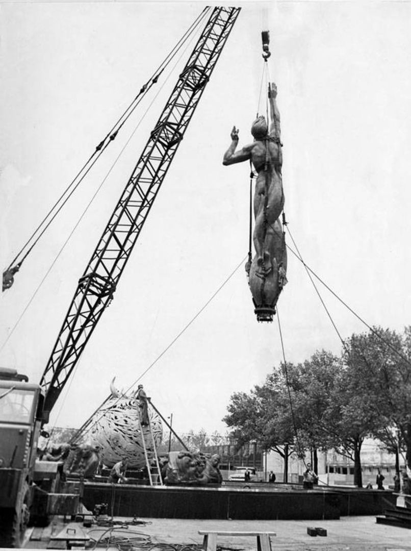 After 19 years of preparations and construction, the memorial was ready to be officially dedicated. On May 30, 1964, thousands of residents and spectators descended on Cleveland’s downtown Mall for Memorial Day celebrations and the dedication of the “Press War Memorial Fountain,” which featured the Fountain of Eternal Life sculpture. The sculpture itself featured four large granite slabs and a towering bronze figure arising upwards out of flames and a sphere meant to represent the universe. In all, the monument towered 46 feet above the ground. Marshall Fredericks described his work on the sculpture, stating, “This figure expresses the main theme of the Memorial Fountain, namely, the spirit of mankind rising out of the encircling flames of war, pestilence, and the destructive elements of life, reaching and ascending to a new understanding of life. Man rising above death, reaching upward to his God and toward peace.” Placed around the monument and inlaid upon the granite labs would be inscribed bronze tablets containing the names of local residents who perished during the Second World War and the Korean War.