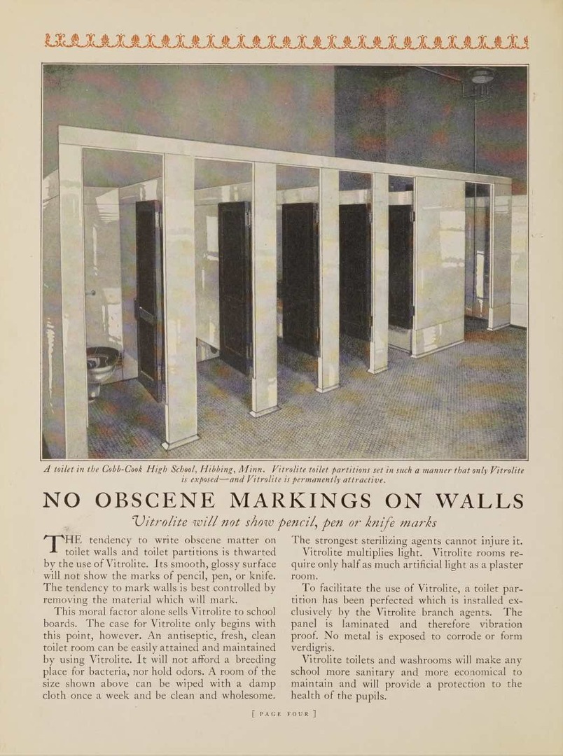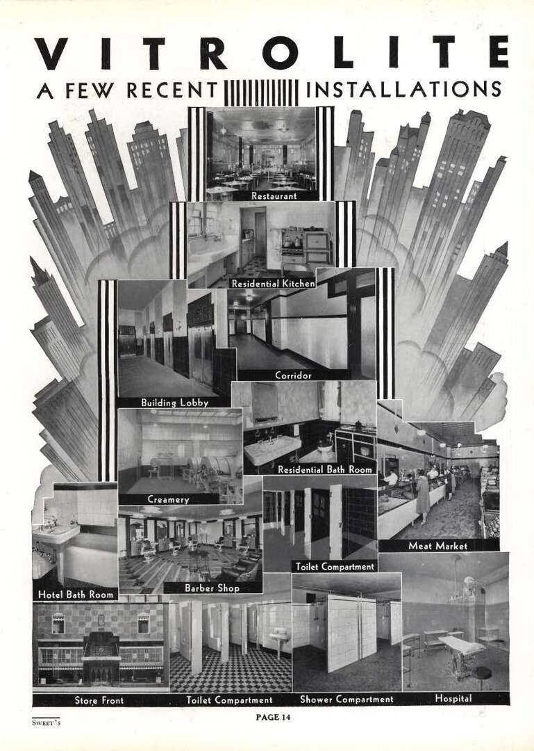 In addition to wall veneers, the glass was utilized in decorated lobbies, restroom partitions, and tabletops and countertops in restaurants, including in downtown Cleveland's Hippodrome Cafeteria and Mills Cafeteria. Hospitals, barber shops, and beauty parlors also found Vitrolite panels and fixtures conducive to cleanliness and ease of maintenance. By the 1920s, the product was so common in the kitchens and bathrooms of residential homes that its name was lowercased as “vitrolite.” Ultimately, artistic applications of Vitrolite emerged, including sculpted and etched paperweights, ash trays, glass figurines, and knick-knacks.