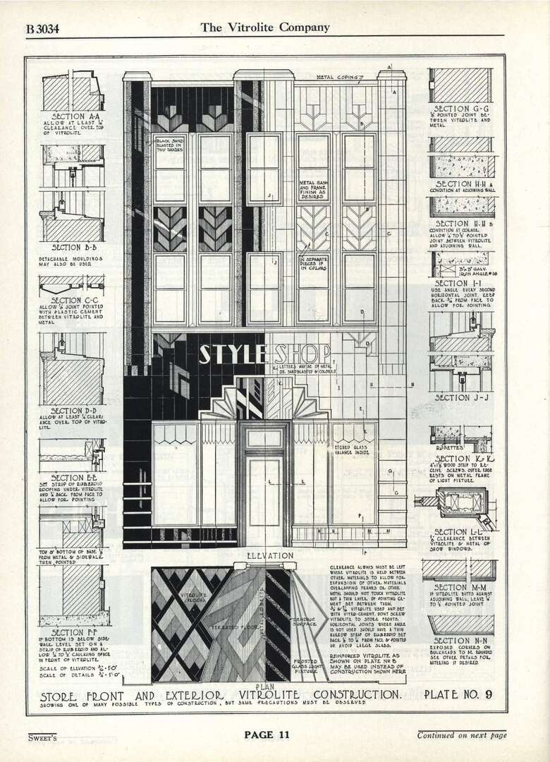 Thanks to its affordability and versatility, Vitrolite rapidly became popular throughout the U.S. and even abroad, and by 1923 it boasted representatives in 32 North American cities plus London, Sydney, Osaka, Shanghai, and Bombay. The company had established a Cleveland presence by 1912, when it operated out of 650 Woodland Avenue, but by 1921, the company had moved to 2909 Detroit, the building immediately east of where it established its new showroom in 1926. The product found many applications that fit the popular Art Deco, Streamline, and Moderne architectural styles of the 1920s through the 1950s. It typically served as a marble substitute for building design and applications. While it originated in oil-whie (milk glass), Vitrolite ranged in color from black, beige, and ivory to greens, blues, jade, and gray. One very popular application, storefront remodeling, was seen most everywhere in the country and involved the application of Vitrolite panels directly over masonry walls to ‘glamorize’ the presentation of window goods via clean, shiny, marble-like surroundings. Interior applications featured colorful etched and engraved Vitrolite glass-paneled lobbies and elevators in many American downtown buildings.