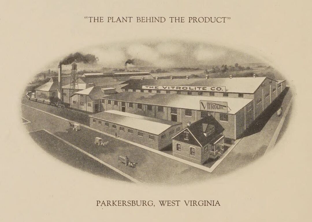 Vitrolite was a brand of pigmented structural glass in the form of tiles and sheets known for a clean, shiny, colorful appearance. It was originally produced in 1908 in Parkersburg, West Virginia, by the Meyercord-Carter Company, whose founder George Meyercord of Chicago was anxious to expand his advertising sign business. Meyercord gathered investors and experienced glass manufacturers to guide the production of ‘milk’ glass. Parkersburg was in the middle of the ‘glass belt’ spanning northeastern West Virginia, southern Ohio, and western Pennsylvania. Several glass manufacturers in this area relied on the abundant energy provided by coal and natural gas in West Virginia and the ease of transport afforded by the Ohio River. Meanwhile, technological advances in the early twentieth century transformed the glass industry from a labor-intensive, manual process to machine-driven mass production. Instant business success prompted Meyercord to change the company’s name in 1910 to the Vitrolite Company with a second factory in nearby Vienna, West Virginia.