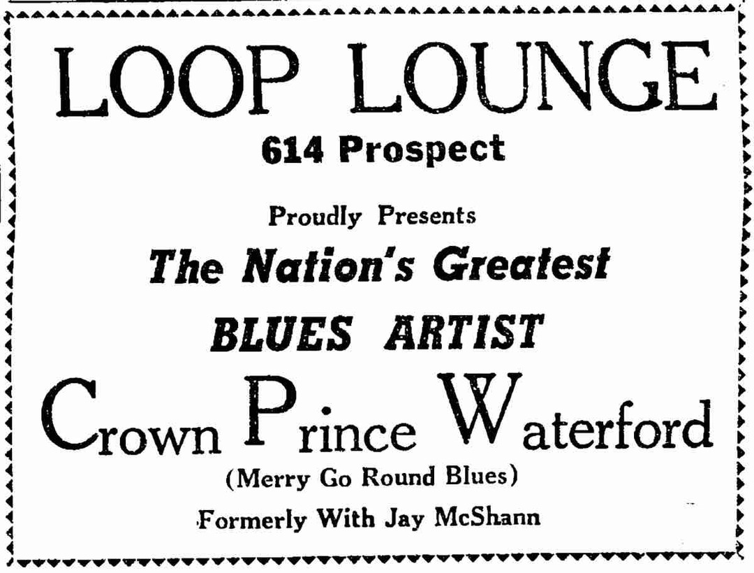 Waterford, who made his living as an itinerant musician, made his first known appearance in Cleveland sometime in 1950. At this point, he had recorded for several different labels like Hy-Tone in Chicago and King Records in Cincinnati. In May 1950, Waterford played his first show at the Loop Lounge, a Prospect Avenue nightclub that attracted many notable musicians such as Dizzy Gillespie and Billie Holiday. From July to mid-August that same year, Waterford performed nightly at one of the most well-known clubs in Cleveland, Cafe Tia Juana, which was located on East 105th Street. After this six-week engagement, Waterford was informed by his booking agency that he was scheduled to appear in Kansas City where he would form his own band. From there Waterford and his band performed at the Municipal Auditorium in Kansas City, followed by an additional fifty-two one-night shows throughout the South and finally to the West Coast, ending in Los Angeles.