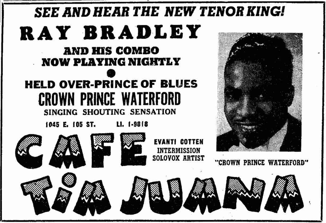 Waterford continued to frequent Cleveland's leading nightspots. In September 1951, he returned to Cafe Tia Juana, where he shared the stage with Ray Bradley and his Combo, who were playing nightly at the popular south-of-the-border-themed nightclub. Additionally, his sister Evanna Cotten (sometimes referred to as “Evanti”) played the solovox during the intermission of Waterford’s set. Waterford played at Cafe Tia Juana until November 1951. After he completed his engagement at Cafe Tia Juana, he went on another tour where he played in numerous cities in the South and ended in California. Waterford returned to Cleveland in late 1952, and by this time his Orchestra had disbanded and he began to play independently. Waterford, along with other local performers, was invited to play at Jack’s Musical Bar on Cedar Avenue in April 1953, where he reportedly gave an “in-command performance.” Waterford was the main act on the Friday night he performed and then played two additional shows the following Saturday. A Call and Post reporter noted that Crown Prince arrived at Jack’s Bar, “Big, handsome, and in his finely tailored full dress suits of various colors.”