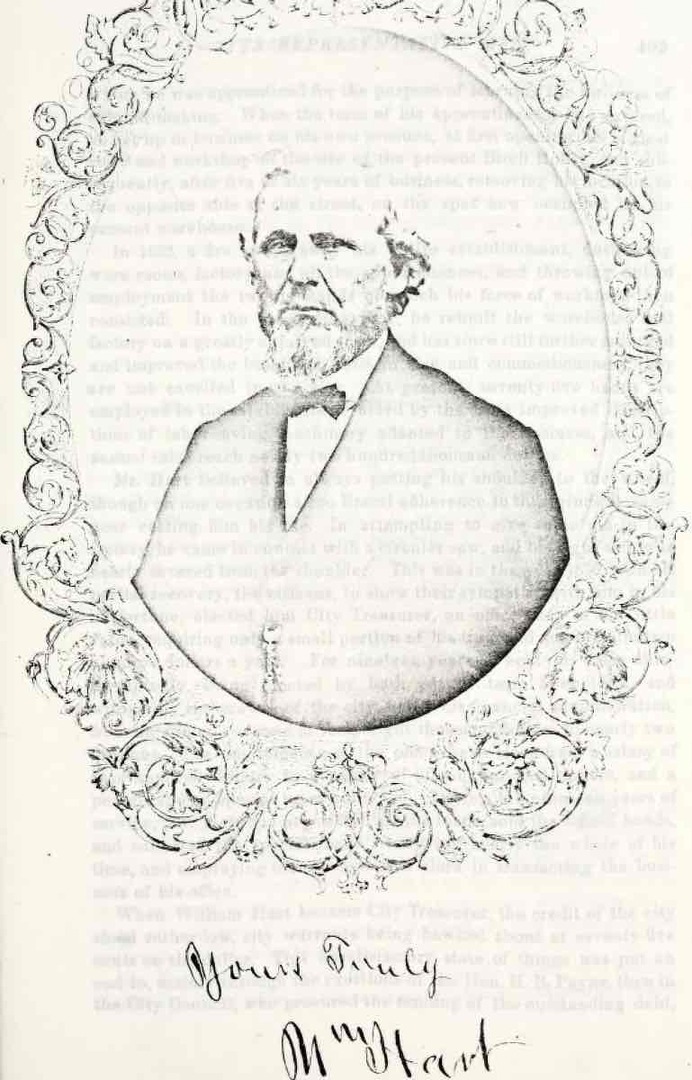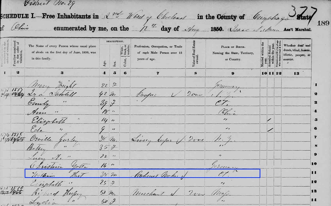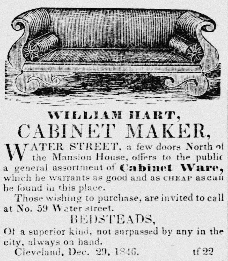 William Hart (1811–1892) was born in Norwich, Connecticut, and migrated to the former Western Reserve with his parents and seven siblings in 1821 or 1822. Hart’s first experience in Cleveland was sleeping in the family’s covered wagon a couple of blocks west of Public Square, where they stopped on their way to the place they settled in Lorain County. About two years later, Hart’s parents both died within days of each other, orphaning eight children. In 1825, the same year that the Ohio & Erie Canal construction began, 14-year-old William moved to Cleveland to work as a cabinetmaking apprentice to Asabel Abel. After his apprenticeship ended, he opened his own small workshop and store at 49 Water Street near present-day Lakeside Avenue in 1834. That same year, he married and took up residence a block east of the shop on Bank Street.