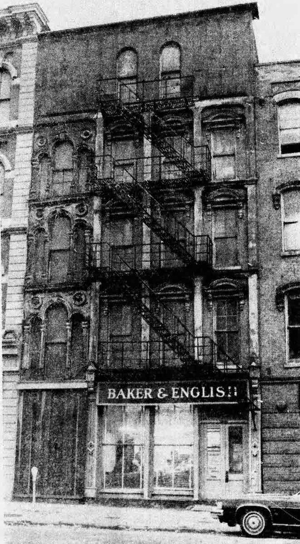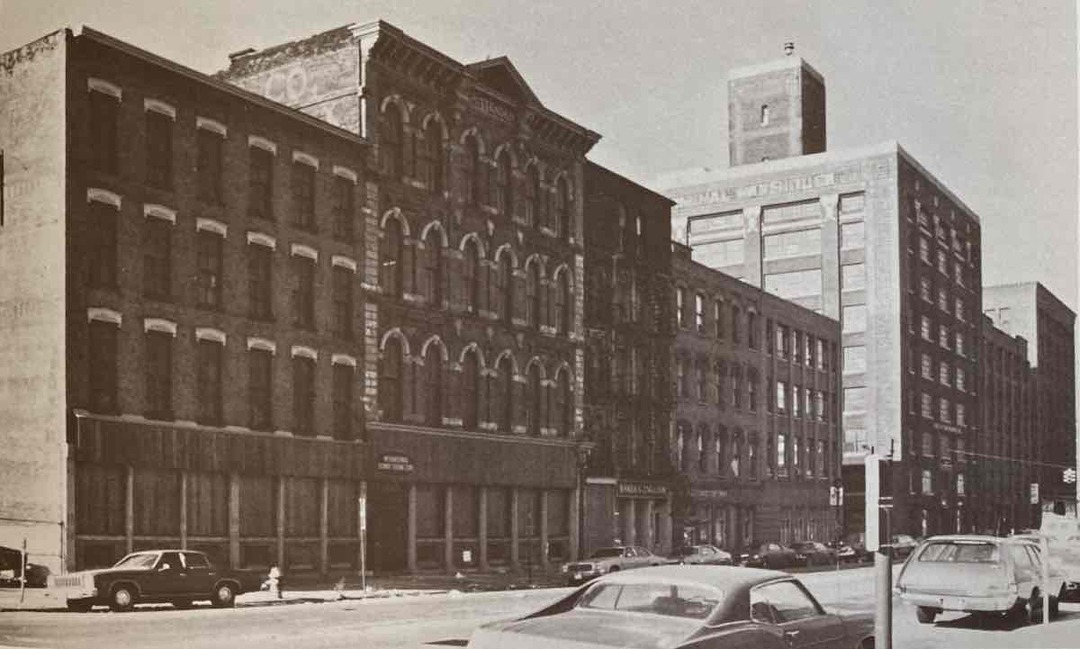 Undeterred, in 1853 Hart reopened briefly on Bank Street while he completed a larger four-story building at 103-105 Water Street (today 1370 West 9th Street). In 1868, two years after partnering with his son-in-law Hezekiah P. Malone to become Hart & Malone, he expanded to encompass the nine-foot-wide space between his building and the newly built Crittenden Block to its south. This became 107 Water Street (now 1374 West 9th Street). To match its cast-iron facade, he covered the old building with ornamental tinwork. This was at the height of the popularity of cast-iron facades, which also covered similar buildings erected in other cities in the 1850s-80s, perhaps most notably in New York’s SoHo and Tribeca districts. Hart also added a mansard roof on the fifth floor that further unified the two buildings. Today the facades appear more distinct because the older building’s tin facade was later removed to expose the brick.