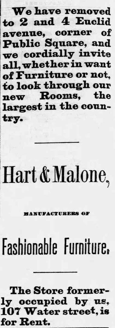 In 1874, Hart & Malone was on the leading edge of an eastward shift of retailing when it moved from Water Street to 2 & 4 Euclid Avenue at the southeast corner of Public Square, lending higher visibility in what was on the cusp of becoming the heart of downtown. Hart & Malone probably struggled amid the economic downturn after the Panic of 1873. In 1875, Hart, who had already retired a few years before, left the business in the hands of an assignee and moved to Bradford, Pennsylvania, where he invested in the oil business, only to lose much of what remained of his onetime fortune. Meanwhile, his furniture store moved a block south to 15 & 17 Prospect Street just east of Ontario Street, where it continued to unload its remaining stock until it closed in 1877.