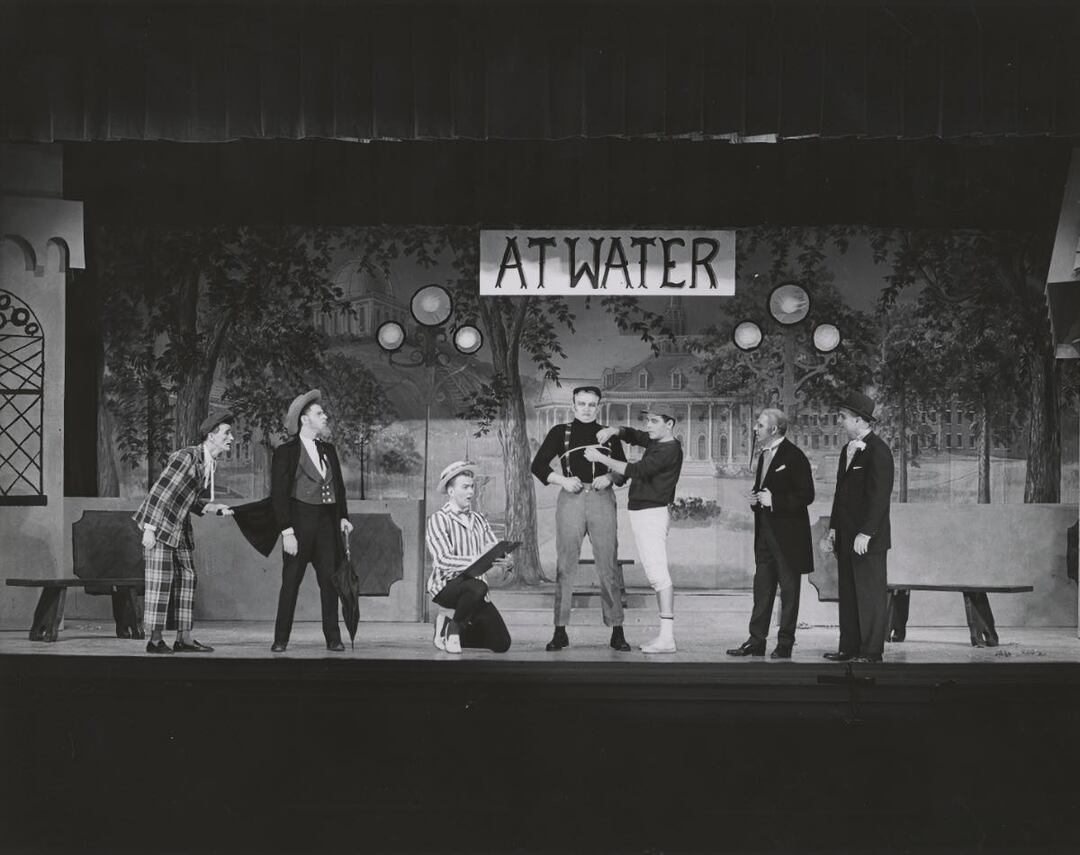 Anything Goes Black and white photograph of seven men on stage with a small-town backdrop with "Atwater" written on a large hanging sign. From left to right, man in a plaid suit with page boy hat, man in waistcoat and tails with an umbrella, man in pinstripe suit kneeling with clipboard, man standing wearing dark 3/4 sleeve shirt and lighter suspendered pants being measured around chest by man to his left, man wearing baseball cap dark sweatshirt and white knickerbocker pants, man in tailed suit with a monocle, and man in bowler hat and suit with flower on lapel. Source: Shaker Historical Society