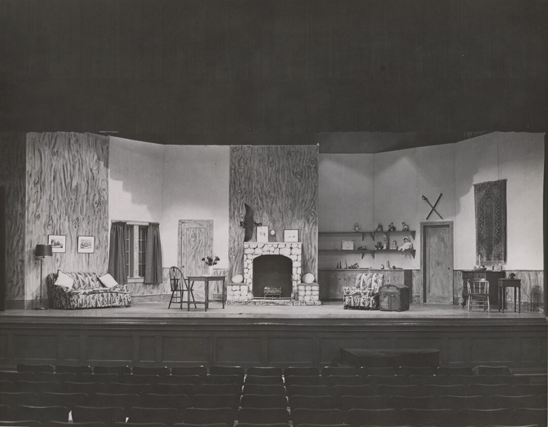 Mr. Barry's Etchings Black and white photograph of the set of "Mr. Barry's Etchings" living room set with couch and floor lamp in front of a wall painted to look like wood with window stage left. Center stage has a door and fireplace with wall painted to look like wood, upstage is a wooden chair and table. Stage right has cubbords and shelves with will dolls, an arm chair and trunk upstage and another door with a dresser and wooden chair with table and rotary phone with a rug wall hanging. Source: Shaker Historical Society Creator: Murray Young