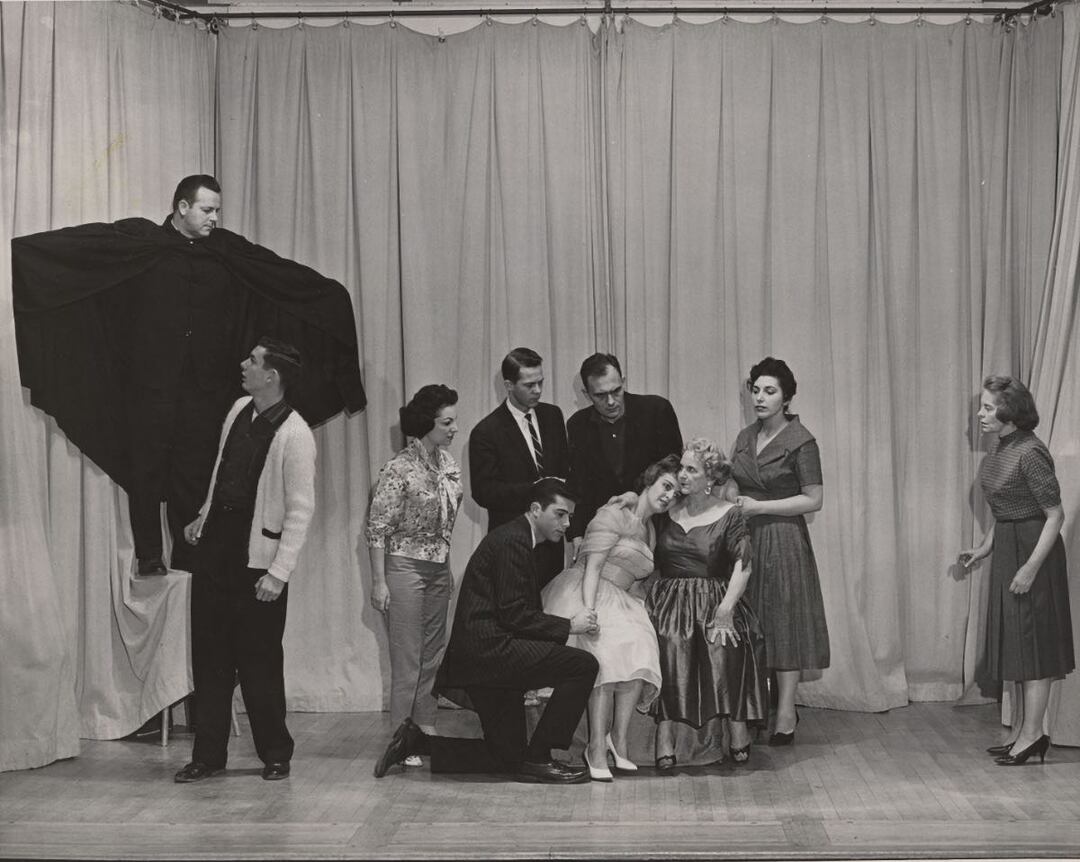 "PICNIC," 1960 "A rehearsal scene from the Shaker Players' production of William Inge's Pulitzer-prize play, 'PICNIC' which opens for a four night run on Wednesday November 30th, reveals the cast in the variety of emotional moods they must portray in Inge's powerful play. Pictured are Sandra Reese, Mrs. William K. Sinclair, Laurence Simmons, Mrs. Jack E. Berno, Miss Brenda Stone, and Bert Dragin. The community theatre is in its forty-second season. Performances are staged in the theatre-auditorium of the Shaker Heights High School." Source: Shaker Historical Society Date: 1960