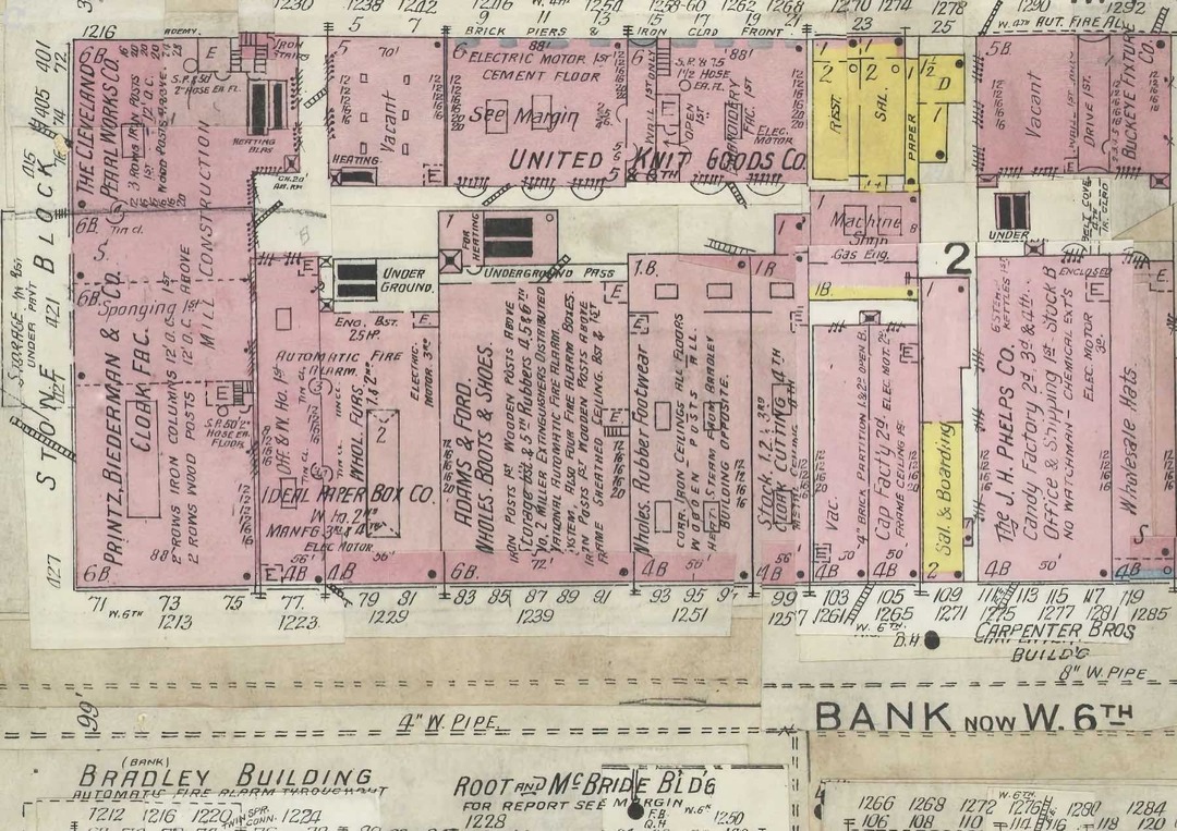 The Hart & Co. Building is located at 1235 West 6th Street in the Warehouse District and currently contains the Hat Factory Lofts and Richardson Design. The Hart & Co. Building was commissioned in 1888 by Elbert Irving Baldwin, one of the city’s oldest dry goods merchants, who came to Cleveland in 1857. The building’s first tenant was E. L. and F. W. Hart & Co., which leased the building until 1900. Hart & Co. was one of the most prominent millineries in a millinery market that ranked third in the nation (behind New York and Chicago) by 1895. Hart & Co. made hats for women and imported hats and materials from Europe. Hart & Co. sold straw, felt goods, feathers, flowers, ostrich plumes, ribbons, silk, velvets, ornaments, and other goods for making hats; many of these items the company sold made their way to the “far west and extreme south.” Furthermore, in 1897 it was reported that thousands of milliners (most of whom were women) came to Cleveland each year from Ohio, Indiana, Kentucky, Michigan, and Pennsylvania to see the latest spring hat designs.