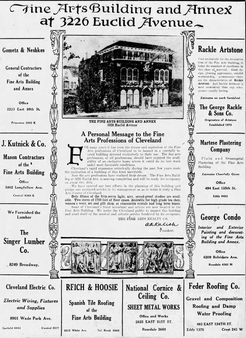 The Fine Arts Building opened in 1921 to great fanfare. Located on Euclid Avenue between East 30th and East 36th Streets in the historical stretch of Millionaires’ Row, the Fine Arts Building was built in an era of great change in Cleveland. By the 1920s, Millionaires’ Row was starting to lose the eponymous millionaires who developed the area, as Euclid Avenue became more focused on commerce.