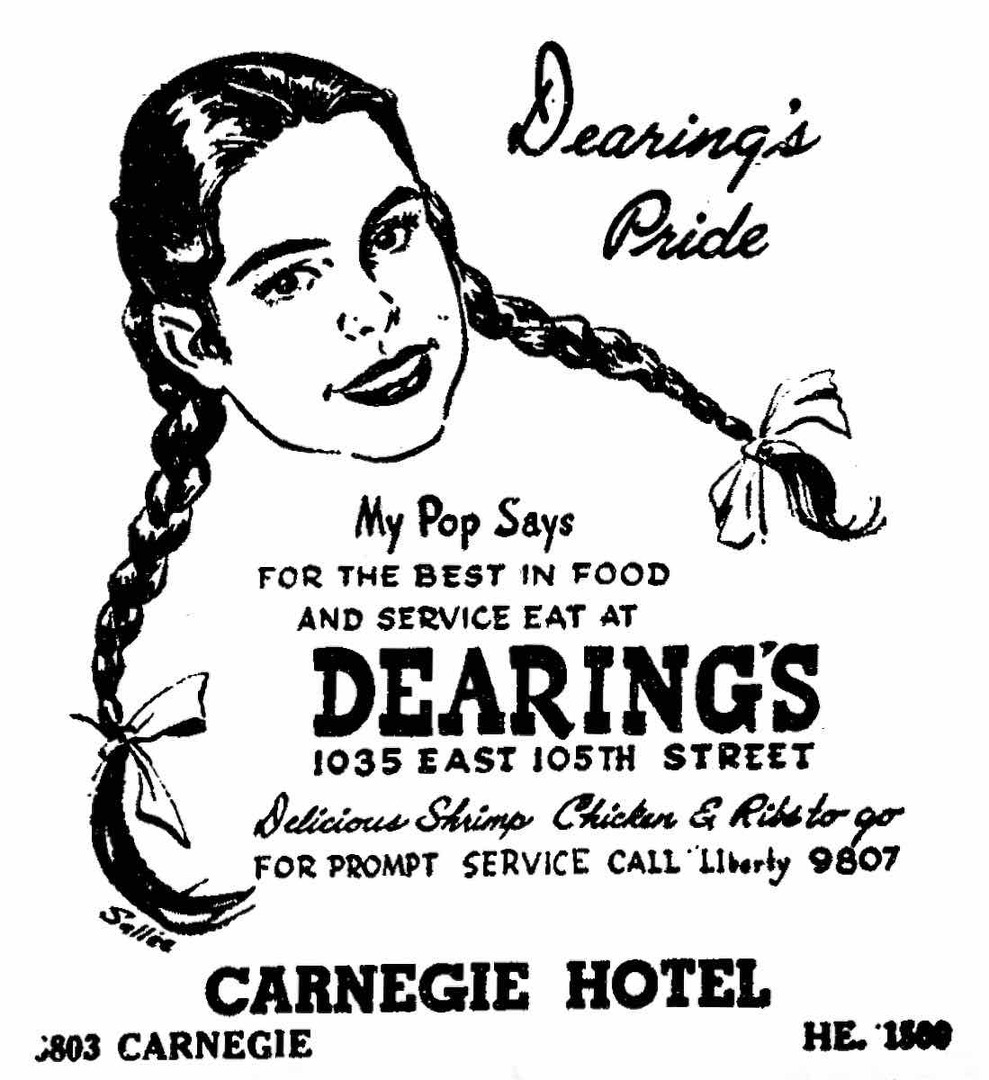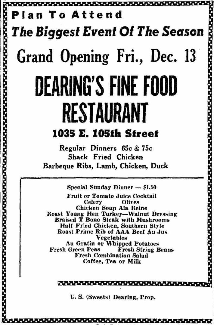In 1956, the Call & Post, Cleveland’s weekly African American newspaper, praised a leading light in the city’s restaurant field: “There is a double-star attraction featured by U. S. Dearing ... which has attracted the happy attention of approximately 65,000 Clevelanders during the past six months. Dearing’s double-feature is not a song and dance team or a couple of nationally famed stage stars; it is his Golden Brown Fried Chicken and his Hickory Smoked Barbecue.” So good was Dearing’s food that his wife, said to be a “fine cook” in her own right, confided to the paper that she usually served the restaurant’s food at parties in their 783 East Boulevard home: “I find it just too difficult to match the cooking that comes out of my husband’s kitchens,” she exclaimed.