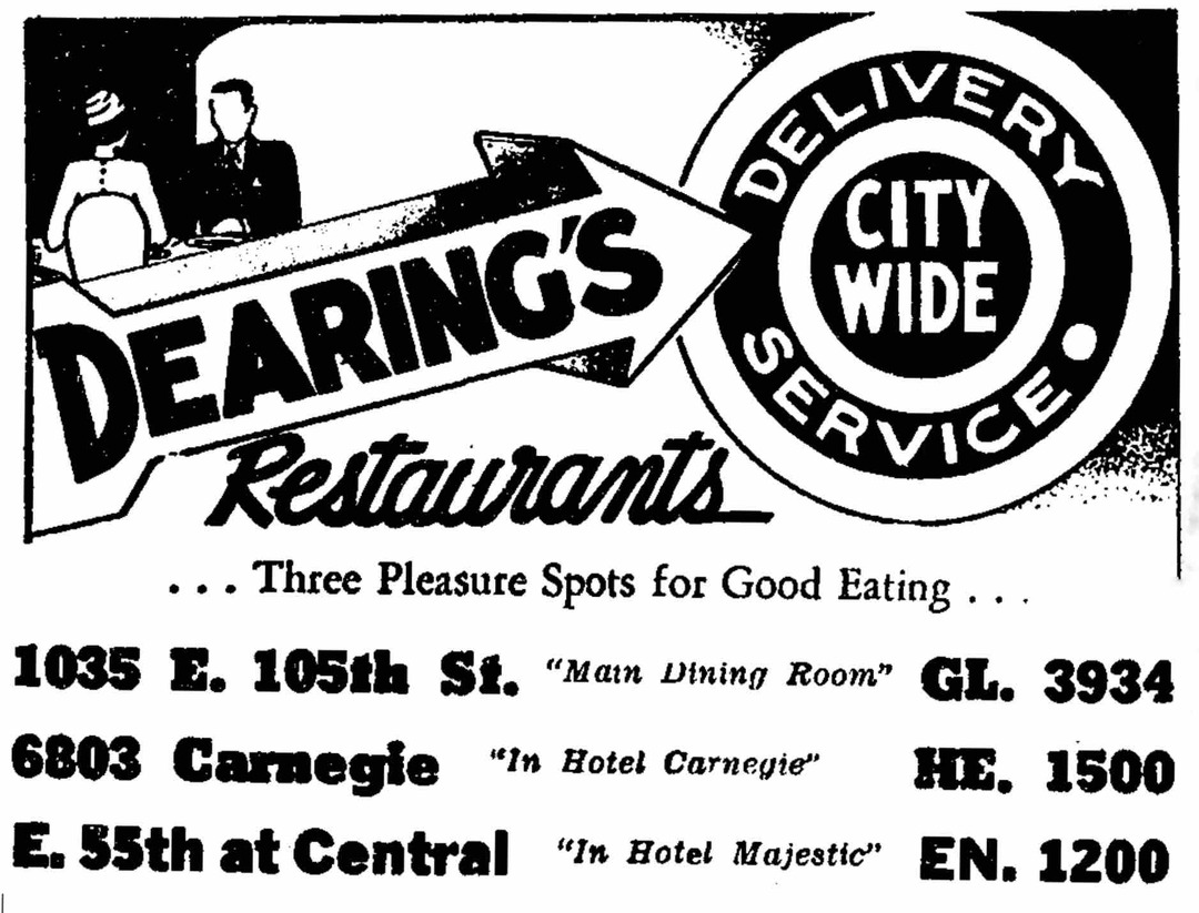 Following the end of World War II, Dearing finally hit his stride, entering what was to turn out to be a nearly four-decade run. In 1946, he opened his newest Dearing’s restaurant at 1035 East 105th Street. His move to 105th, the main commercial thoroughfare running through Glenville, placed Dearing’s among the vanguard of Black-owned businesses in a neighborhood that was soon to transform from one of the city’s prime Jewish communities into the so-called “Gold Coast,” which supplanted “Green Pastures” as the most coveted address for upwardly mobile African Americans. For several years he shared his block with other illustrious Black-owned establishments, including Cafe Tia Juana, Gold Coast Tavern, and Mercury Bar.