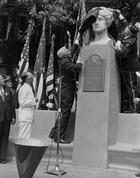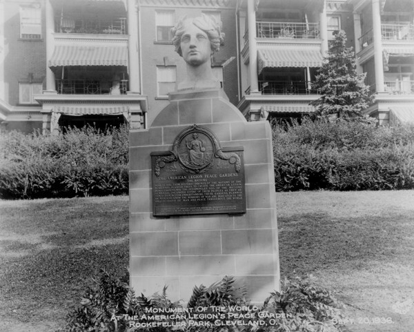 From Clara Lederer's The Paths Are Peace - "The chief feature of the Garden of the Nations is a semi-circular, high-backed seat of classical design, surmounted by the head of a beautiful woman, symbolizing peace, and done in Tennessee marble by Henry Herring... Also upon that occasion, the soil from twenty-eight nations was deposited by ambassadors and consular representatives of those nations in a marble crypt at the base of the monument, and the bronze tablet now covering it is inscribed: 'Here in soil from historic shrines of the Nations of the World, are planted trees to create the American Legion Peace Gardens. May the intermingled soil of the nations symbolize the united effort of their peoples as they advance to a better understanding. These gardens planned by men who know the horrors of war, are dedicated to the brotherhood of man and peace throughout the world. Established by The American Legion 1936 Convention Corporation of Cleveland and dedicated by Ray Murphy, National Commander, The American Legion.' The author of the tablet was Legionnaire Glen Campbell and the sculptor was Frank L. Jirouch."