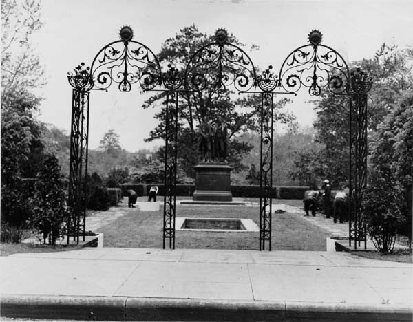 Clara Lederer writes that "The Cultural Gardens fountain, stone walks and double lateral sections of linden alleys center about an impressive bronze two-figure statue of Johann Wolfgang Goethe (1749-1832) and Friedrich von Schiller (1759-1805), Germany's greatest two poet-philosophers. The statue is a replica of the famous Weimar statue, modeled in 1856 by Ernest Reitschal, the Dresden sculptor. Here tower the two mighty figures, joined in friendship as they were in life, and grandly dominate the spacious and imposing German Garden. The garden is entered at the upper Boulevard level through a triple-arched ornamental iron gate. The German Cultural Garden was dedicated on June 2, 1929, as part of a week-long celebration commemorating the Lessing-Mendelssohn Bi-centennial. The Lessing bust was unveiled at this time, and the Goethe-Schiller statue, which formerly had stood in Wade Park, was rededicated in its new place of honor in the German Garden."